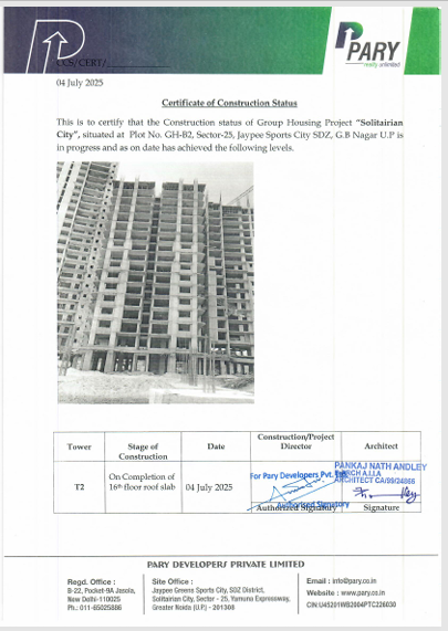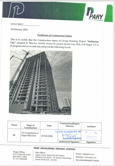 We are pleased to present an exclusive residential opportunity for the executives and officers of Rail Vikas Nigam Ltd at the premium residential development Solitairian City, having 100% paid-up land. The project has received Best Project award from Builder Council of India & International Achiever Award in Real Estate Category from Zee Group
