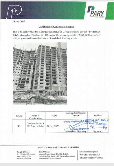 • Located at Jaypee Sports City, SDZ-25, Yamuna Expressway, Gautam Budh Nagar—just 309 meters from Buddh International Circuit • Excellent connectivity to: ◦ Eastern Peripheral Expressway ◦ Yamuna Expressway ◦ Upcoming Noida International Airport (set to become operational in early 2026) ◦ Delhi NCR employment hubs This makes Solitairian City an ideal residential choice for working professionals and government executives.