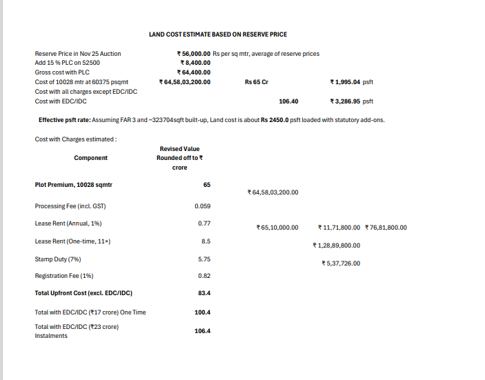 1.Land acquisition cost estimated on basis of Yamuna Authority, YEIDA auction notice of November 2025.