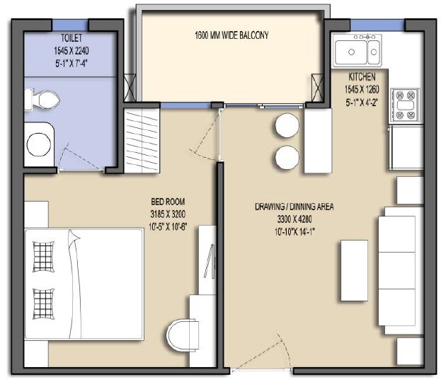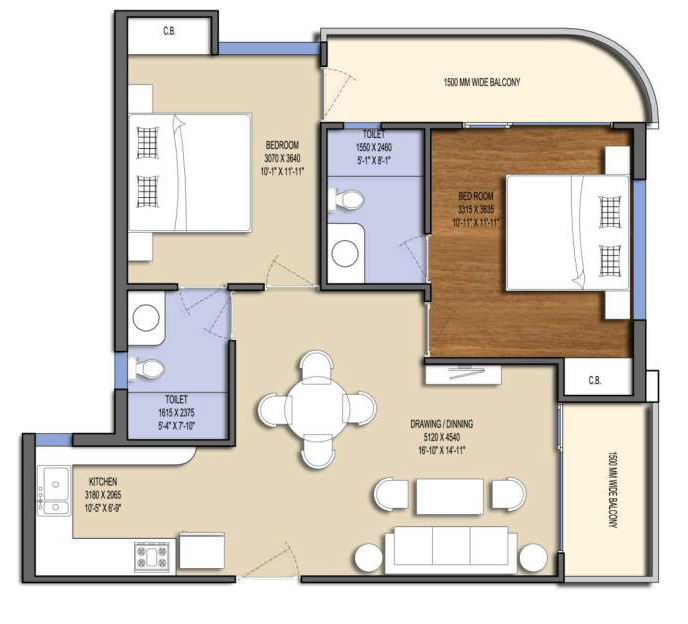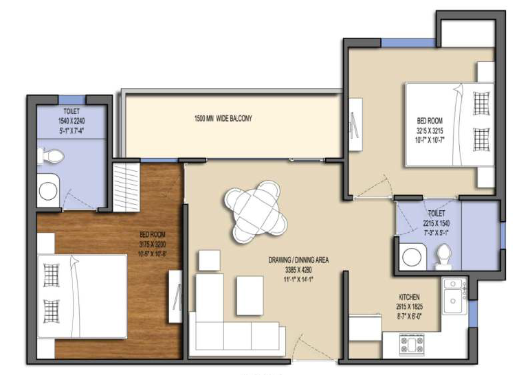2 BHK 1000 sft Carpet Area 631.41 Balcony 76.1sft