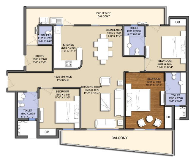 3 BHK 1850 sft + Servant Carpet area 1579.72 balcony 359.73 sft