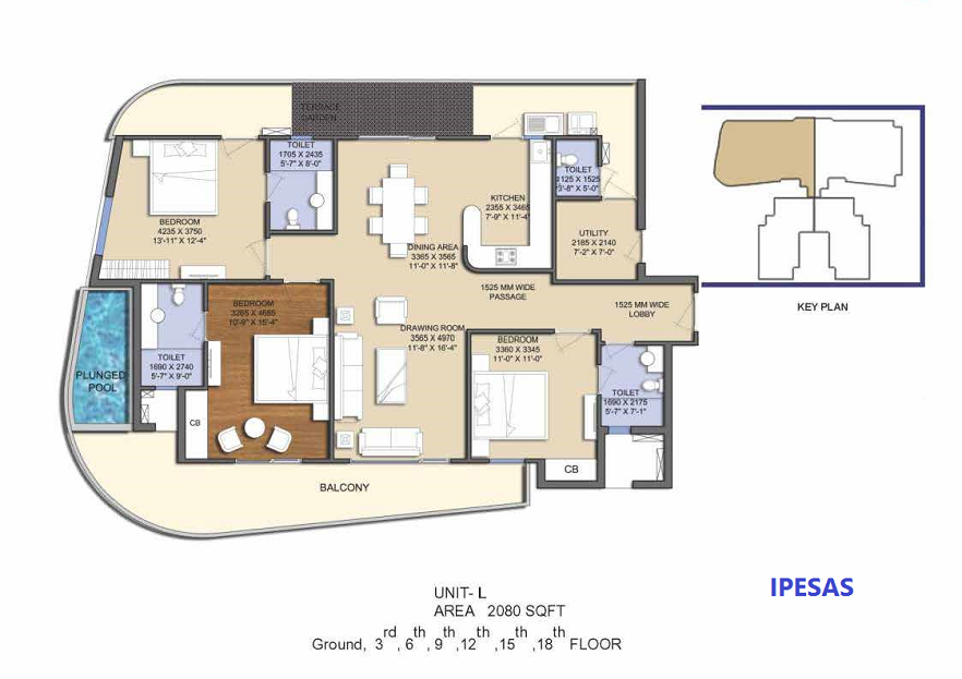 Size 2080 sft 3 BHK + Servant+ Jacuzzi, Carpet Area ( 163.4sq M 1781 sft)
