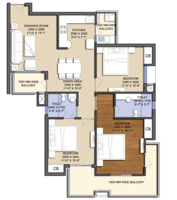 3 BHK 1425 Carpet area1082.53 Balcony 213.12 sft