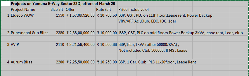 Categories New Projects Society News Projects launched in Sector 22D of Yamuna E-Way. Post author By admin Post date March 21, 2026 March 26 best offers fyi Excel is for offers valid currently, MRP list is attached for reference Tags Jewar Updates, Yamuna Eway ← Possession Certificate & Land offer to PCB Society for Yamuna E-Way upcoming Site → YEIDA Group Housing Bidding Challenges for New Societies
